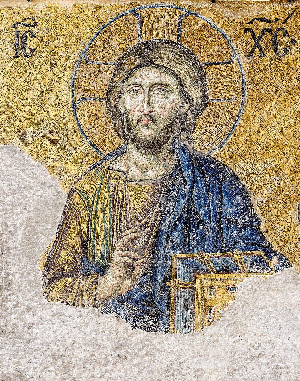 The Christ Pantocrator of the Deesis mosaic (13th-century) in Hagia Sophia (Istanbul, Turkey). Wikimedia