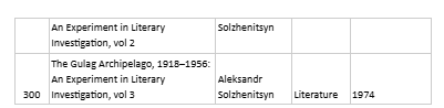 Where singular books are fundamentally structured as three distinct books or volumes, I created three separate entries. Divine Comedy, The Lord of the Rings, and The Gulag Archipelago each consist of three separate books instead of one.