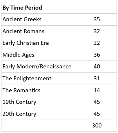 The total numbers were also very telling. St. John’s 158 books show what a 4-year focused program can achieve. On the extreme side, Bloom’s list of over 1,800 seems like a ridiculously high number, with over 1,200 books just from the 20th Century. Adler’s total of 286 seemed like a challenging but also possible lifelong number to aspire too. But upon further examination the list wasn’t helpful to create an individual book reading list. Where do you start with these famous classic Greek and Roman writers?