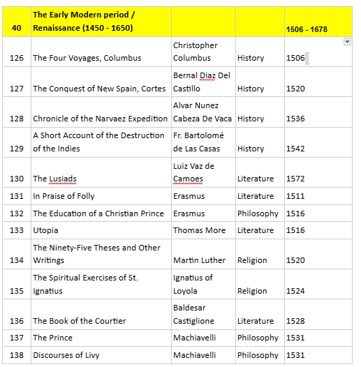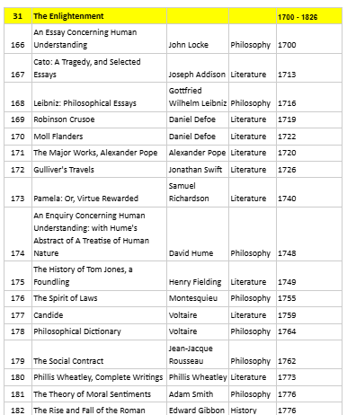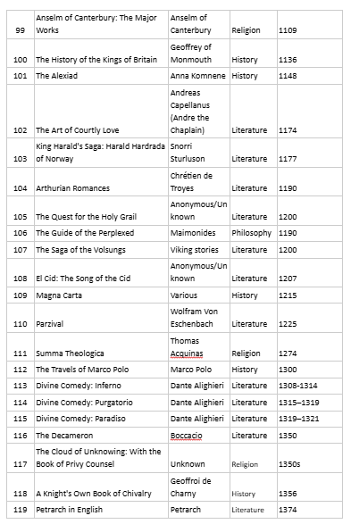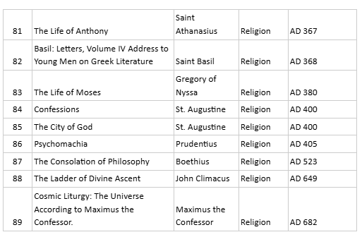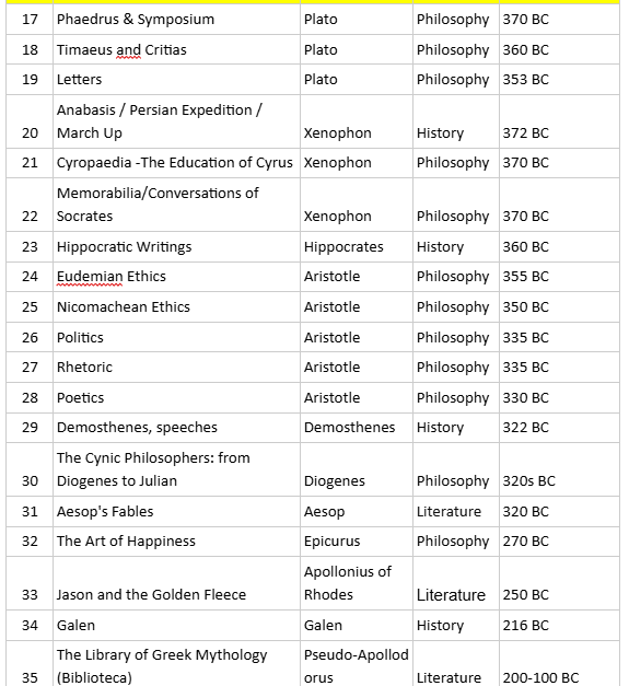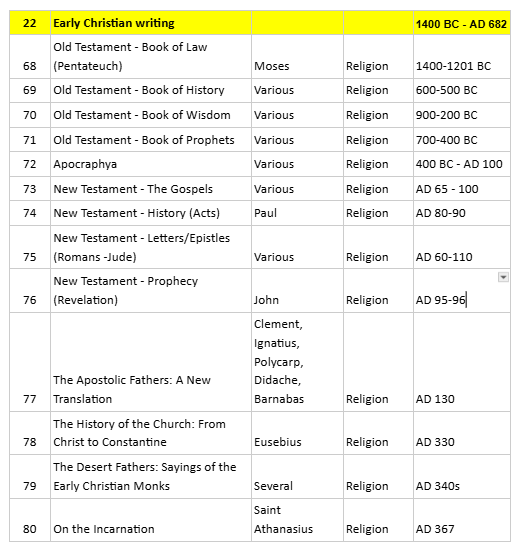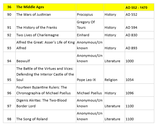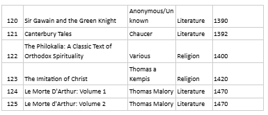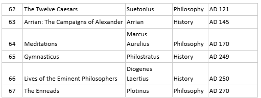 In addition, some key authors were missing. No Hesiod, Xenophon, Polybius, from the classical Greeks nor any of the Stoics, such as Epictetus, Seneca or Marcus Auriellius. Key time periods were also under represented. As a Christian, I wanted to see more Early Christian fathers and their writing included. And I was surprised to see only Bloom include Medieval classics like the tales of King Arthur.