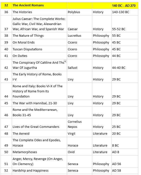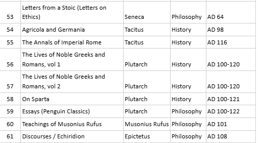My list contains more military histories than I found on any of the three sources listed. Part of the bias is due to my military background as a West Point grad and Army veteran. More importantly, there are great lessons of virtue and strategy to learn from the histories of great military commanders like Xenophon, Alexander the Great, Caesar not to mention Plutarch’s Lives and the Roman historians of Livy, Nepos, Tacitus, and Suetonius.