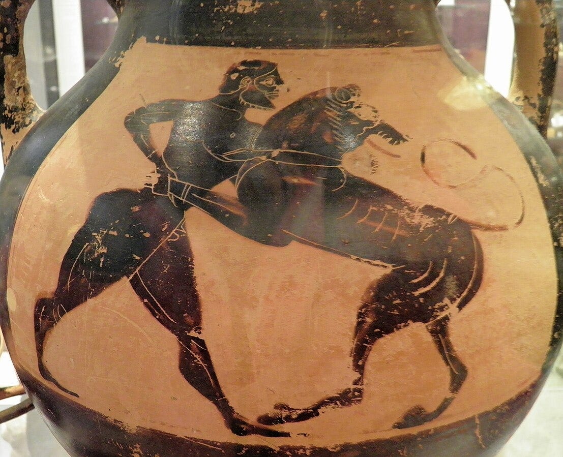 Herakles wrestling with the Nemean lion, 6th century BC, Ashmolean Museum, Wikimedia